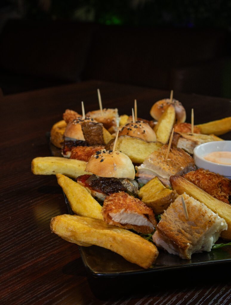 Mini burger maison x5, mini croquemonsieur x5, mini tenders x5, frites à la graisse de boeuf.
