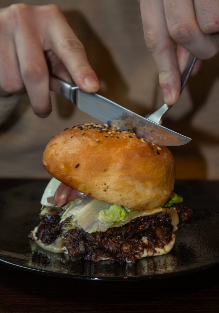 Potato bun maison, effiloché de joue de boeuf, mayonnaise moutarde à l’ancienne touche de miel, tomme de vache, oignon rouge, sucrine.